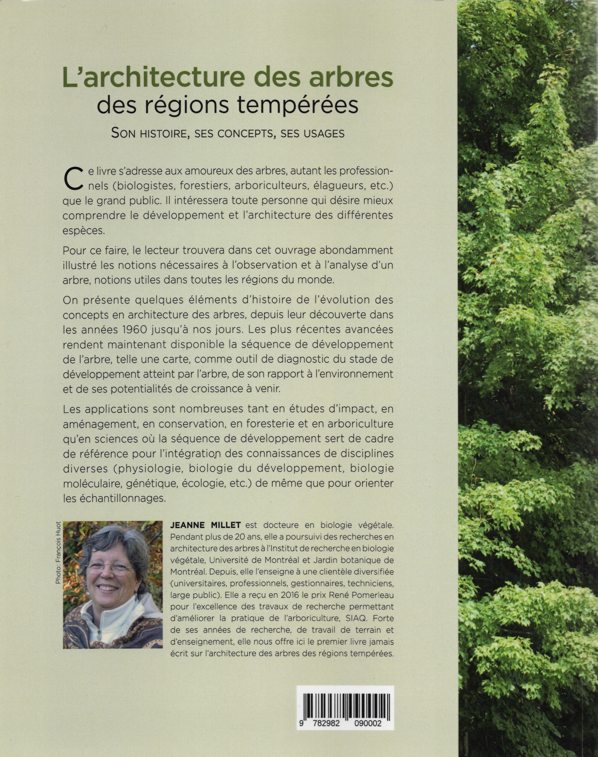 JEANNE MILLET est docteure en biologie végétale. Pendant plus de 20 ans, elle a poursuivi des recherches en architecture des arbres à l’Institut de recherche en biologie végétale, Université de Montréal et Jardin botanique de Montréal. Depuis, elle enseigne à une clientèle diversifiée (universitaires, professionnels, gestionnaires, techniciens, large public). Elle a reçu en 2016 le prix René Pomerleau pour l’excellence des travaux de recherche permettant d’améliorer la pratique de l’arboriculture, décerné par la SIAQ. Forte de ses années de recherche, de travail de terrain et d’enseignement, elle nous offre depuis 2012 le premier livre jamais écrit sur l’architecture des arbres des régions tempérées.